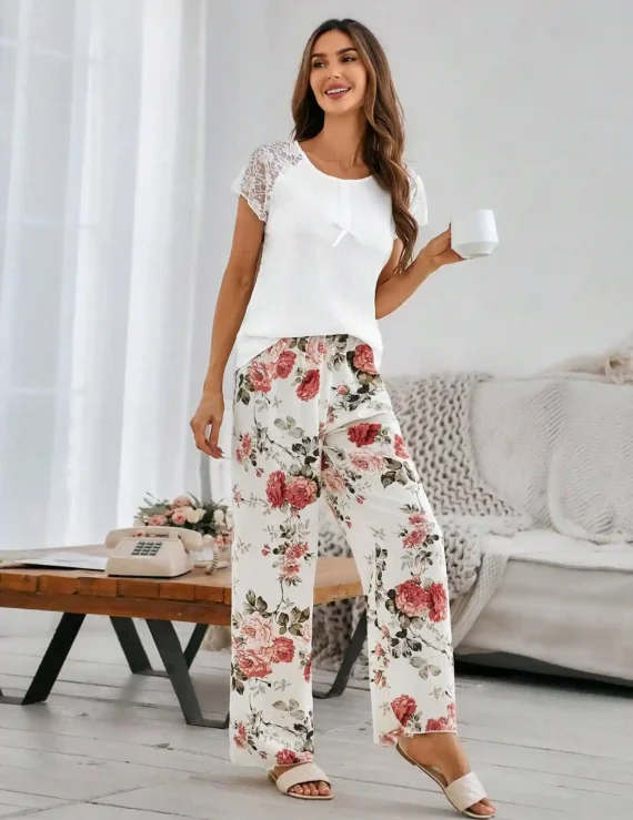 Ensemble Pyjama Multicolore avec Top Dentelle et Pantalon Oversize à Imprimé Floral