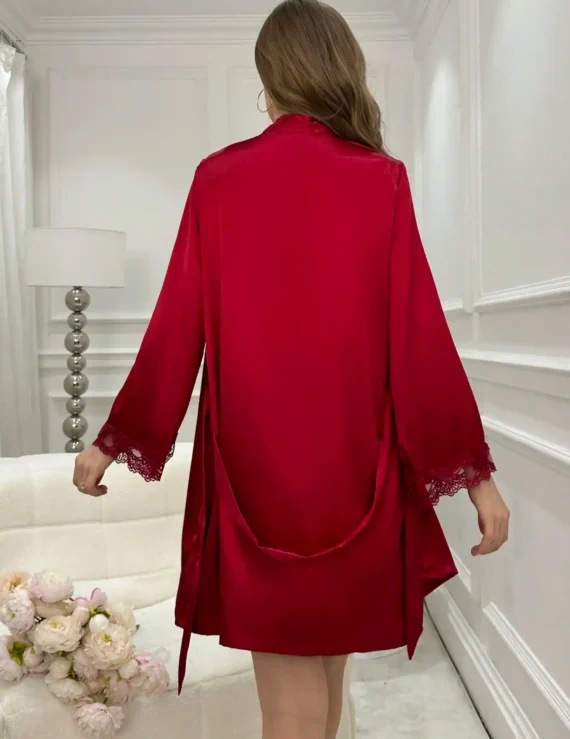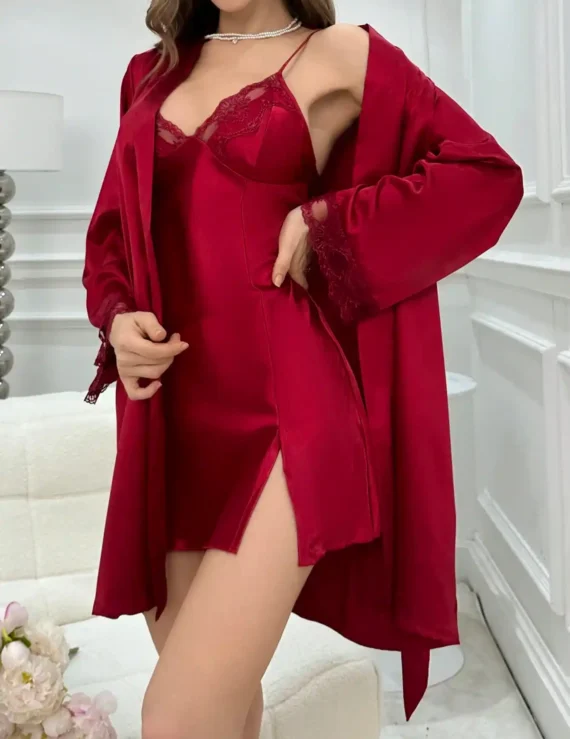 Ensemble Robe de Pyjama Satin avec Camisole en Dentelle et Ceinture