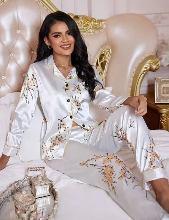 LuxeNights Ensemble de Pyjama Satin Blanc avec Imprimé Floral, Poches Patchées et Passepoil Contrastant