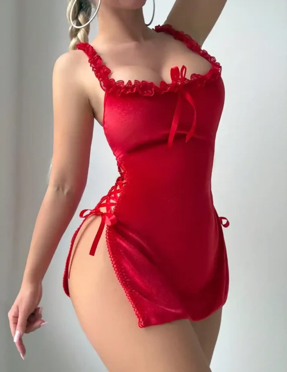 Ensemble 2 Pièces Lingerie et Nuisette Rouge avec Dentelle et Velours