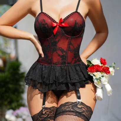 Ensemble 4 Pièces en Dentelle avec Bas et Nœud Papillon