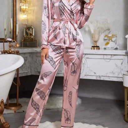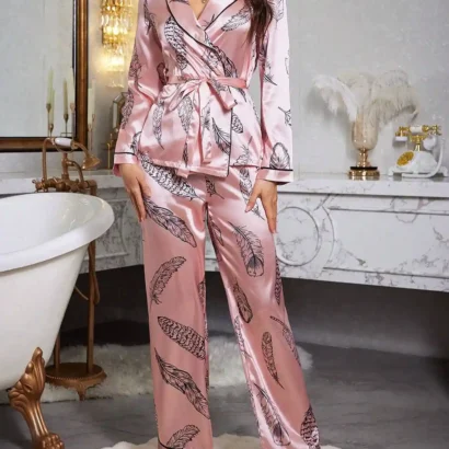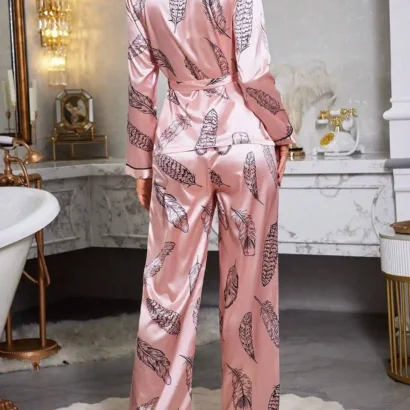 Plongez dans l’élégance avec cet ensemble de vêtements de nuit en satin rose bonbon, sublimé par un imprimé léopard moderne. Cet ensemble comprend un peignoir chic avec col châle et ceinture assortie, accompagné d’un pantalon long confortable. Conçu pour offrir une coupe ample, il allie sophistication et praticité grâce à son tissu satiné doux (97% Polyester, 3% Élasthanne) sans extensibilité.