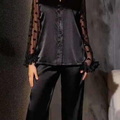 Offrez-vous une expérience luxueuse avec cet ensemble de pyjama en satin noir, rehaussé d’une dentelle 3D en forme de cœur et d’un contraste de maille élégant. Ce set 2 pièces comprend un haut à manches longues avec boutons sur le devant et des volants délicats, ainsi qu’un pantalon long assorti à la taille naturelle.
