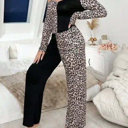 Adoptez un style audacieux et confortable avec cet ensemble pyjama pour femme au motif léopard patchwork. Conçu pour l’été, cet ensemble multicolore se compose d’un haut court à manches longues et d’un pantalon long ajusté, idéal pour des nuits agréables et stylées.
