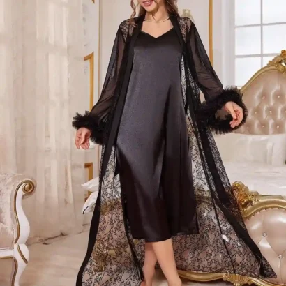 Un ensemble luxueux composé d’une robe cami en satin et d’un peignoir en dentelle, parfait pour allier élégance et confort. Son design raffiné, agrémenté d’appliques en fourrure synthétique et d’une ceinture, apporte une touche sophistiquée et glamour.
