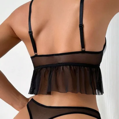 Affirmez votre style avec cet ensemble de lingerie 2 pièces, parfait pour les femmes à la recherche de confort et d’audace. Conçu en noir classique, cet ensemble comprend un soutien-gorge sans fil à bonnets triangulaires en maille patchwork PU et un string assorti. Les détails en tulle contrastant, les découpes et les volants apportent une touche punk et sophistiquée.