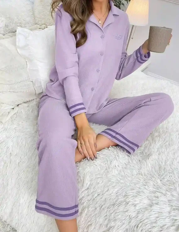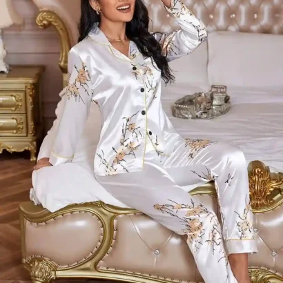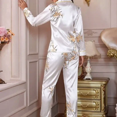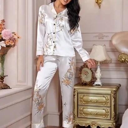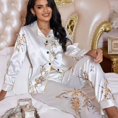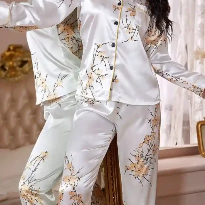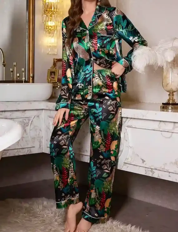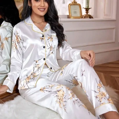 Un ensemble de pyjama en satin élégant et confortable, orné d’un imprimé floral et de détails contrastants, parfait pour des nuits luxueuses à la maison.
