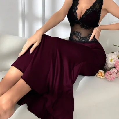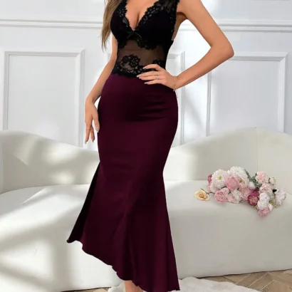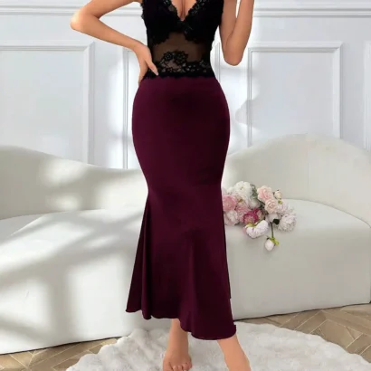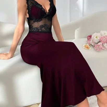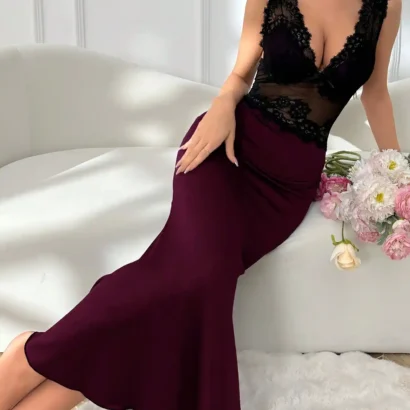 Nuisette maxi sirène élégante avec dentelle bicolore, col en V, et bretelles larges. Une pièce raffinée pour un style majestueux.